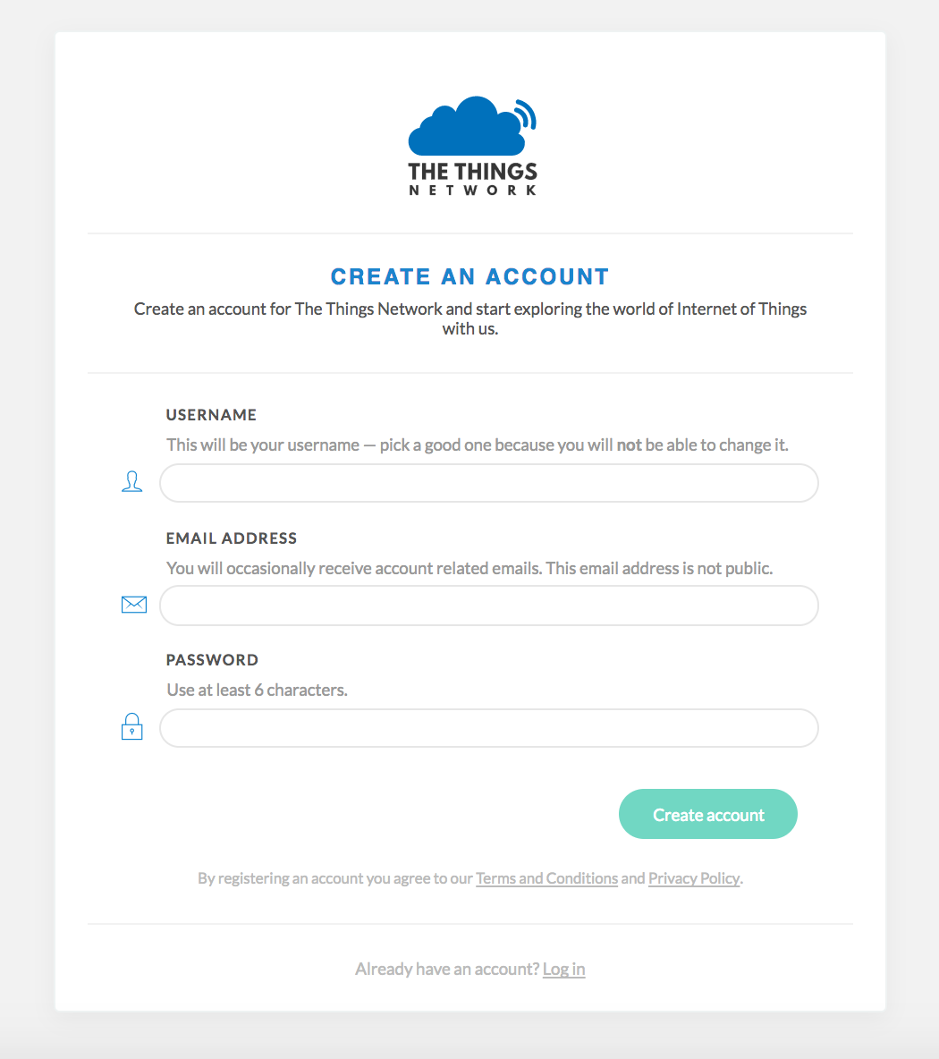 To set up the gateway with The Things Network (TTN), navigate to their website and create/register an account. Enter a username and an email address to verify with their platform.
