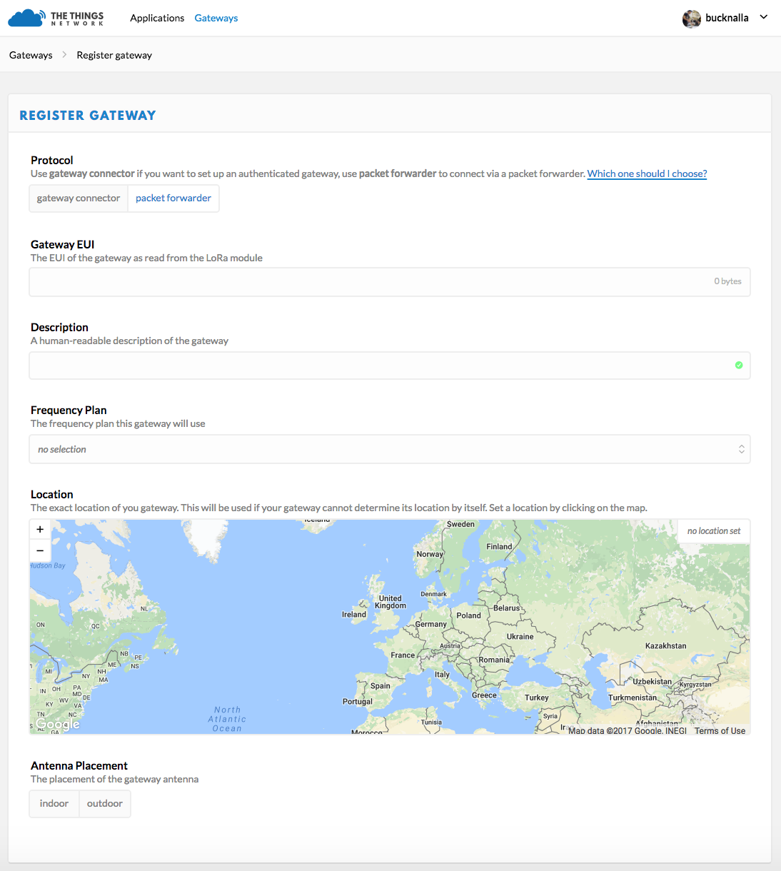 Inside the TTN Console, there are two options, applications and gateways. Select gateways and then click on register gateway. This will allow for the set up and registration of a new nano-gateway.