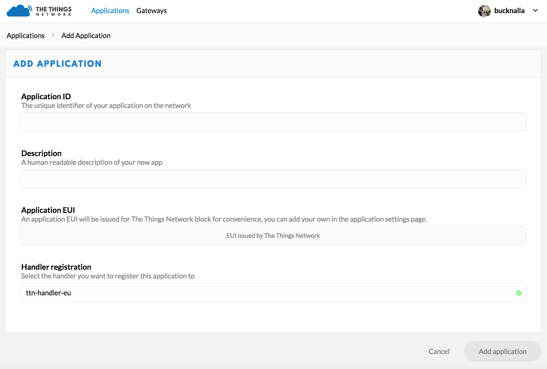 Selecting the Applications tab at the top of the TTN console, will bring up a screen for registering applications. Click register and a new page, similar to the one below, will open.