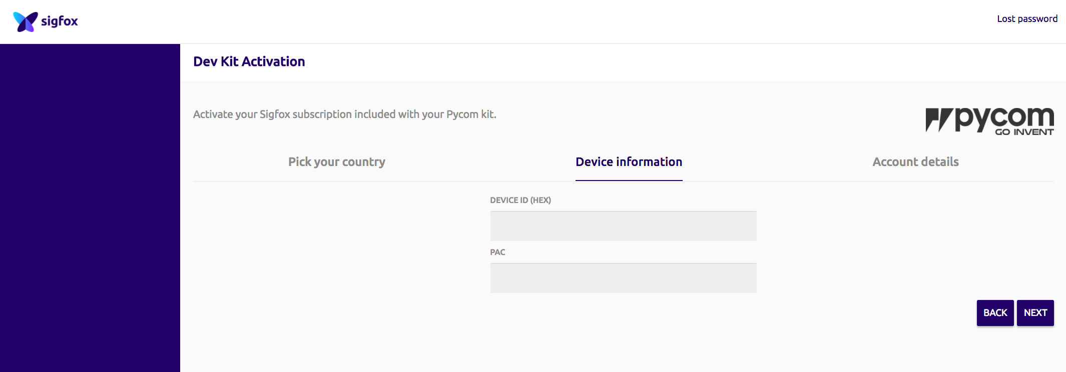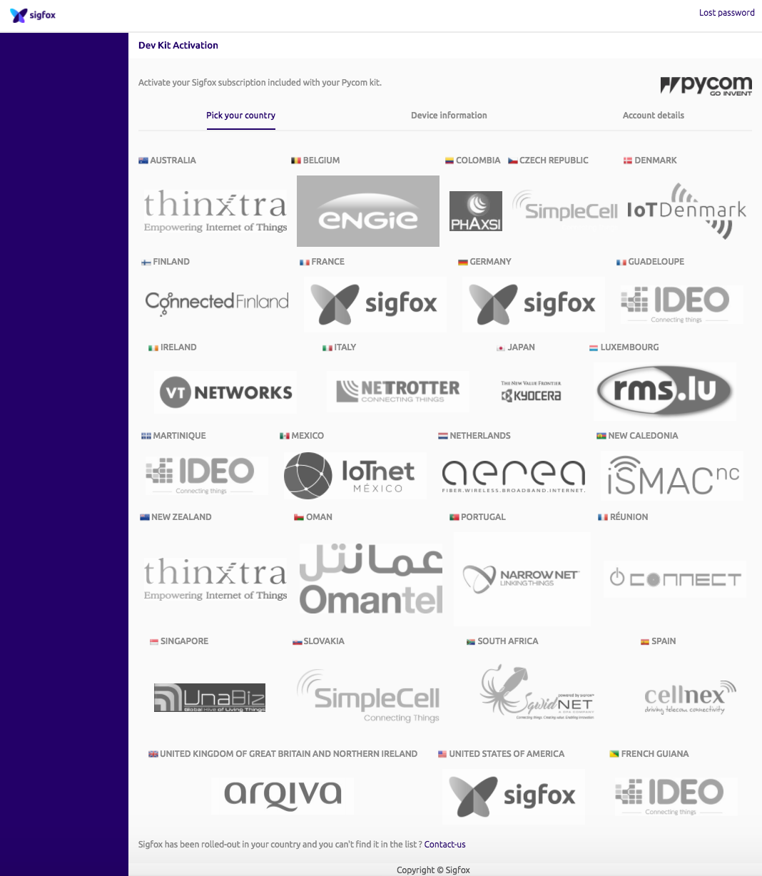 Next choose a Sigfox Operator for the country where the device will be activated. Find the specific country and select the operator to continue.