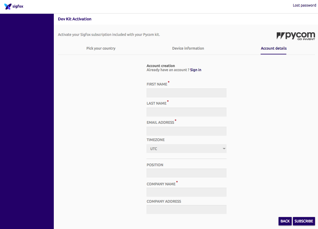 An email confirming the creation of a Sigfox Backend account and the successful registration of the device should arrive at the users inbox.